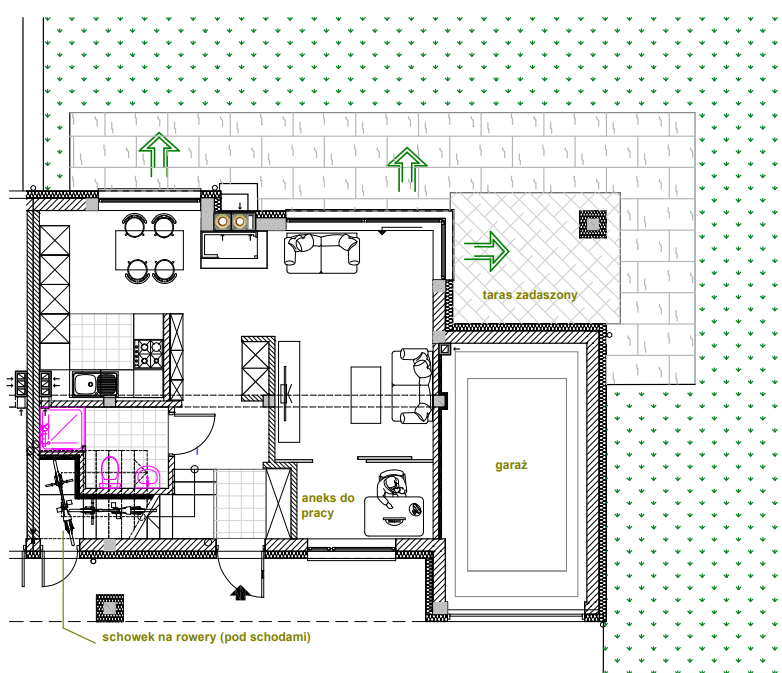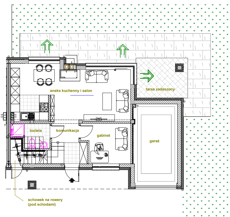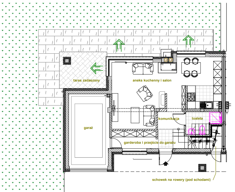W części ogrodowej wydzielony jest zadaszony taras na którym można wypić poranna kawę. Lub posiedzieć w słotne dni. Można również osłonić go szklaną zabudową tworząc w tym miejscu domową oranżerię.